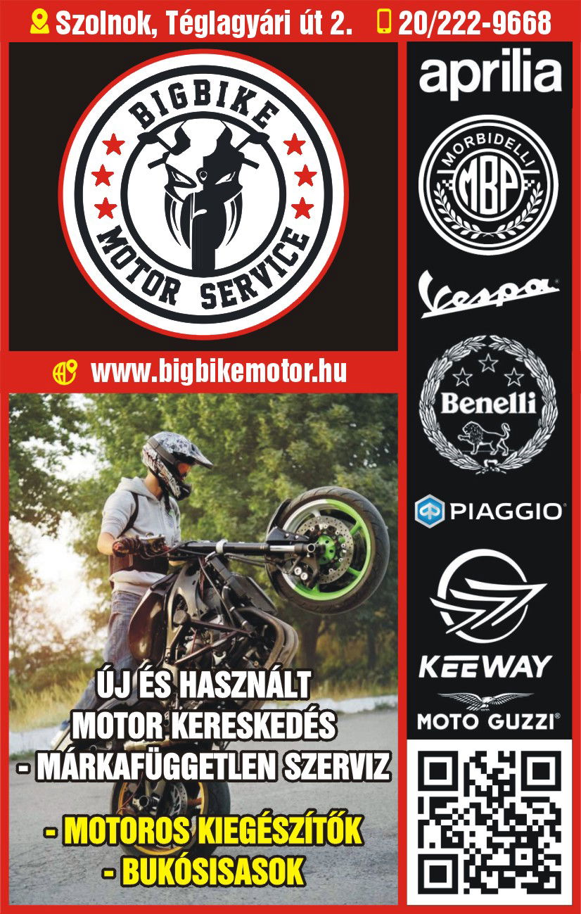 A Big Bike Motor Service Szolnok egyik vezető motoros üzlete és szervize, ahol mindent megtalálsz, amire egy motorosnak szüksége lehet. Legyen szó új vagy használt motorkerékpár vásárlásáról, gyors és megbízható szervizről vagy minőségi motoros kiegészítőkről, nálunk biztosan megtalálod a megfelelő megoldást. Célunk, hogy professzionális szolgáltatásainkkal támogassuk a motorosokat a biztonságos és élménydús közlekedésben.