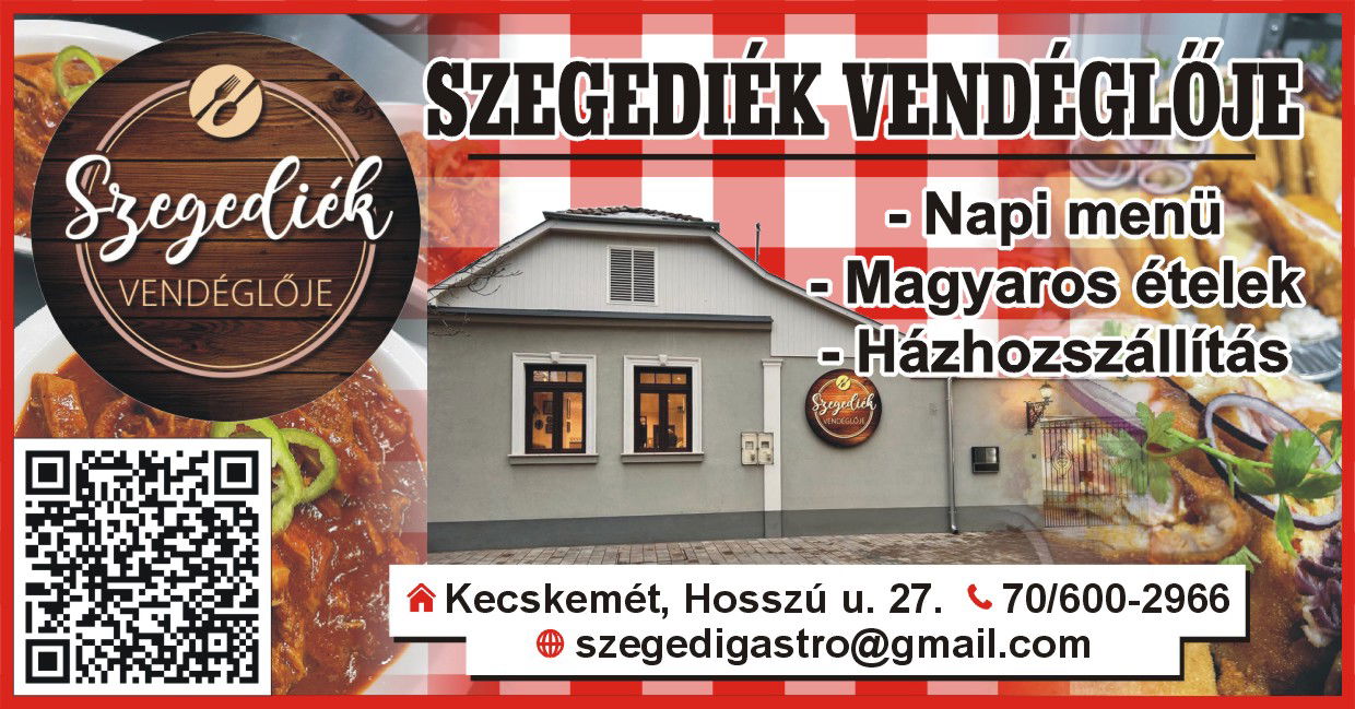 Üdvözlünk a Szegediék Vendéglője oldalán! Ha igazi magyaros éttermet keresel Kecskeméten, ahol a házias ízek találkoznak a vendégszeretettel, jó helyen jársz. Éttermünk célja, hogy minden betérő vendég úgy érezze magát, mintha hazaérkezett volna.